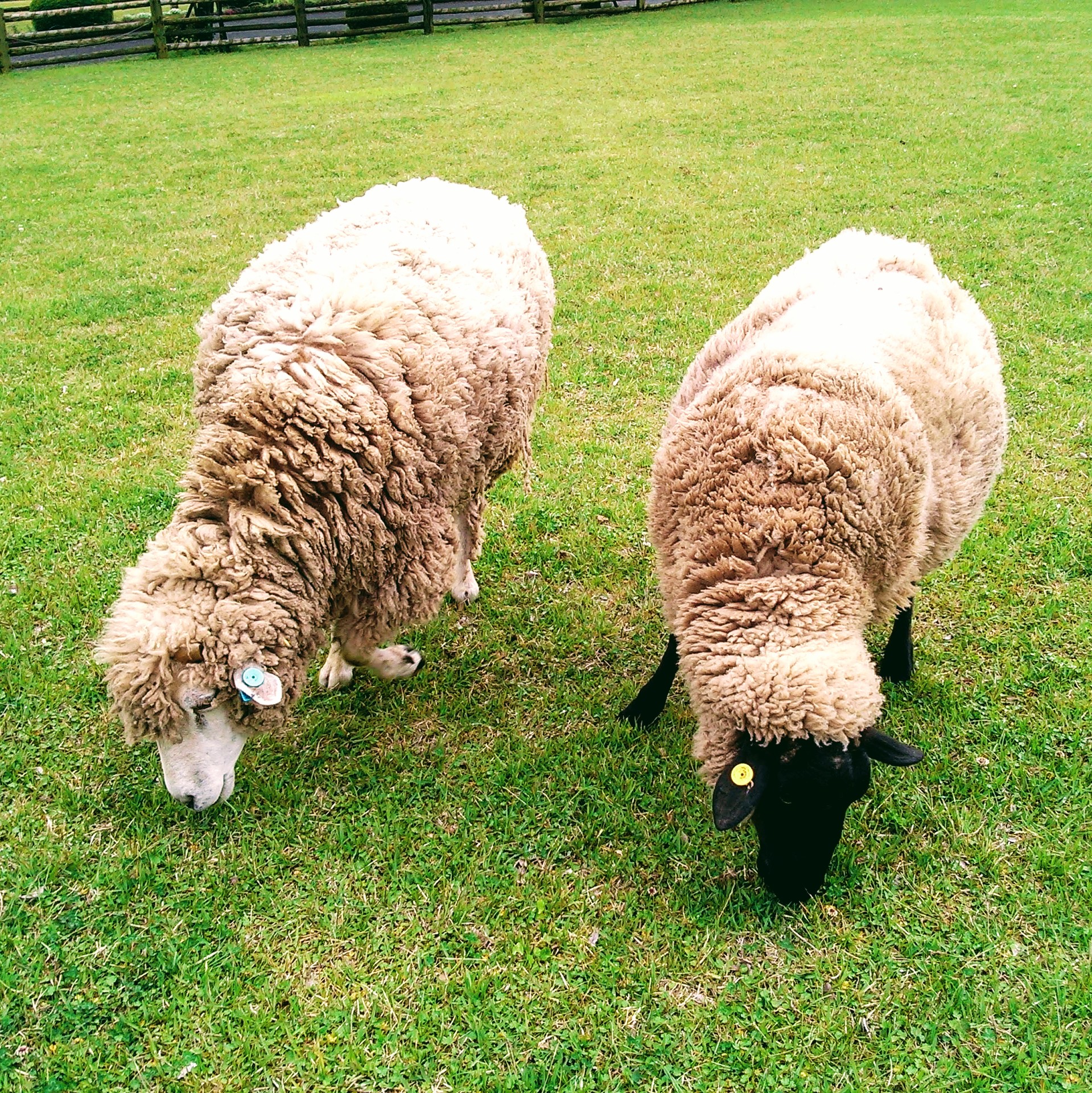 白い羊と黒い羊が良い具合に草食べてたので、写真撮りました。 2頭がちょうど真ん中に来るようにトリミングして、仲良く一緒に2頭でご飯食べてる風に仕上げました。 何とも言えない可愛さを作り出すべく加工しました。