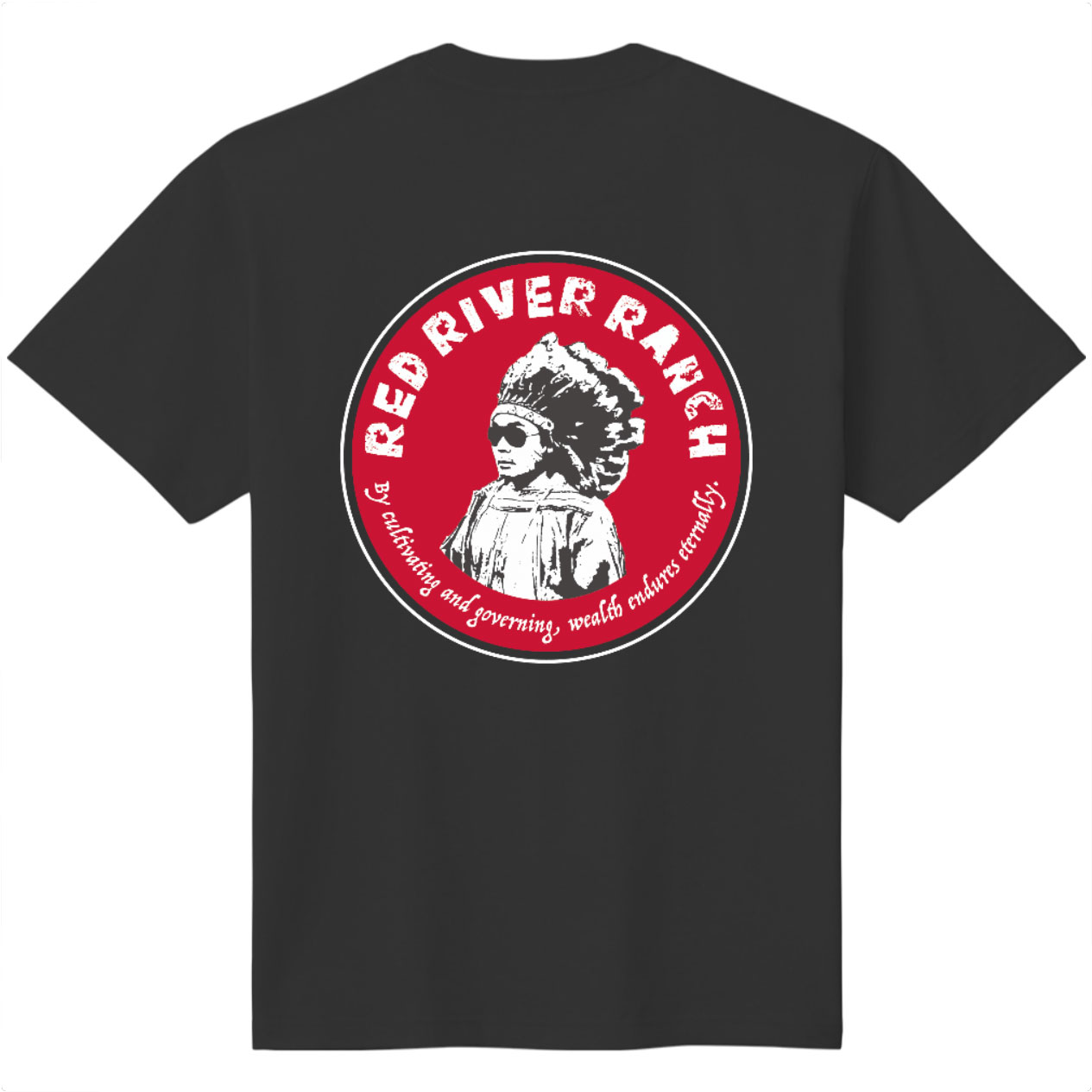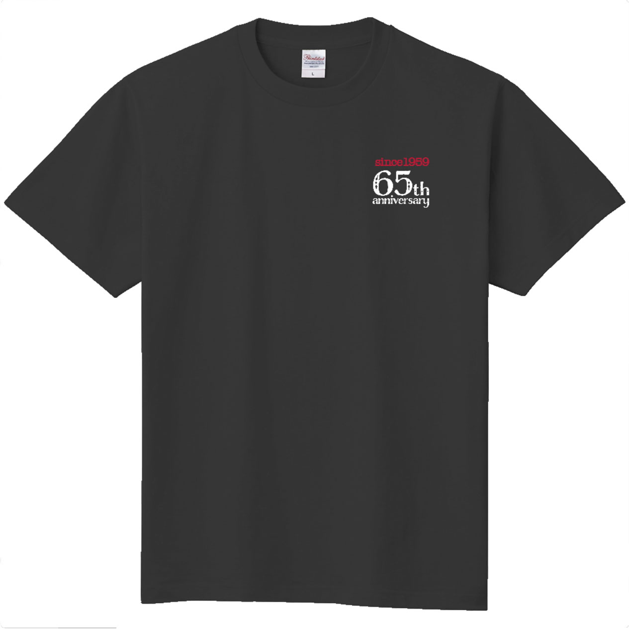 作成したロゴを使って、ヴィンテージ風に仕上げてみました。 Tシャツの色味をダークグレーにし、それに合う赤い色を探すのがとても大変でした。 画像の加工具合に合うフォントを探して上と下で違うフォントにしました。